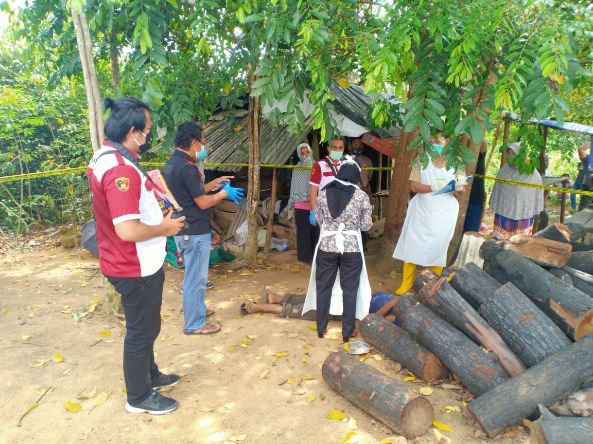 Tim Identifikasi Polres Bangka Barat dan Polsek Simpang mendatangi lokasi penemuan mayat laki-laki di sebuah pondok kebun Dusun Belacan Desa Mayang Kecamatan Simpang Teritip, Selasa (20/10/20) pagi.