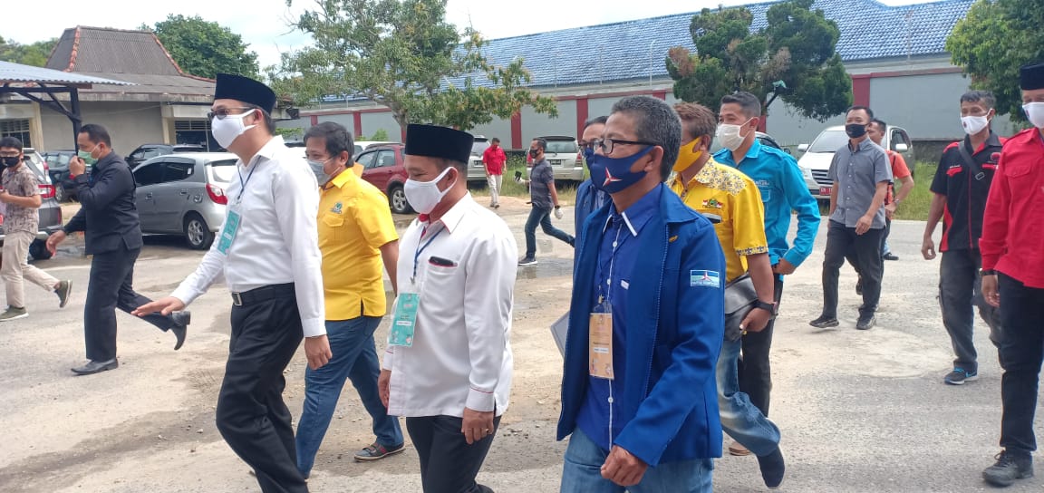 Pasangan bakal Calon Bupati Bangka Barat, Markus – Badri Syamsu berjalan kaki mendaftar ke sekretariat KPU di Jl. Jendral Sudirman No 53 Kecamatan Muntok, Bangka Barat, Jumat (4/9/20) siang.