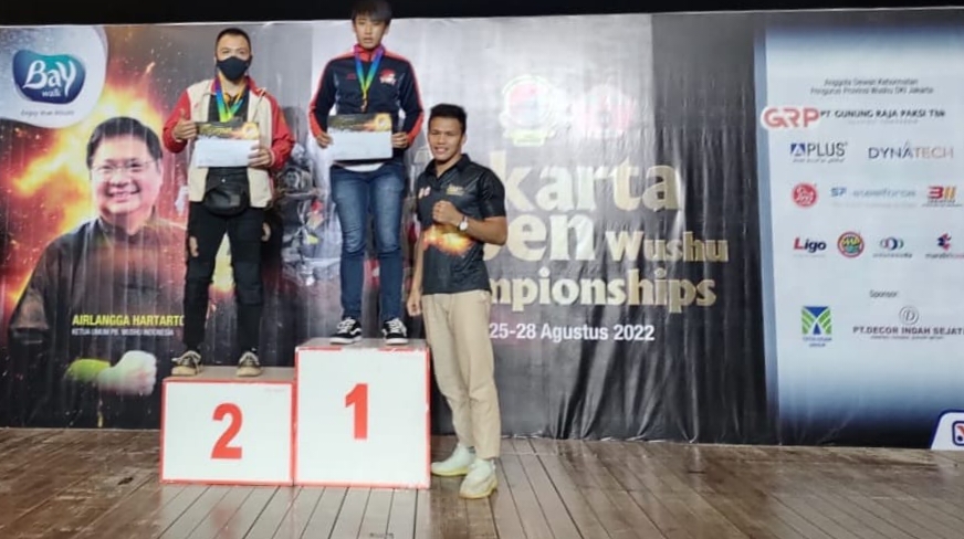 TOBOALI, BERITA BANGKA – Prestasi bidang olahraga Wushu dinampakan Jastine Eriko (20 Tahun) Atlet Wushu asal Camp Guangxi Sanda Wu Bangka Selatan warga Air Lingga Kecamatan Toboali, yang berhasil sabet Juara 1 (emas) Senior kelas 60 Kilogram pada Jakarta Open Wushu Championships 2022, Sabtu (27/8/2022).