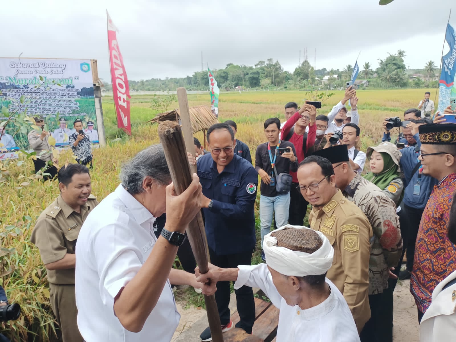 “Hari ini desa kami kembali menggelar tradisi Murok Jerami yang telah ada sejak ratusan tahun yang lalu sejak nenek moyang kami dulu dan kami sebagai masyarakat Desa Namang yang berasal dari suku mangkanau masih tetap menjaga tradisi yang telah ada sejak ratusan tahun yang lalu,” katanya (30/1).