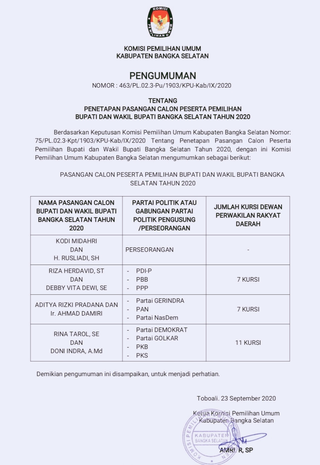“Empat bakal pasangan calon yang mendaftar ditetapkan sebagai calon karena sudah memenuhi syarat sesuai ketentuan syarat pencalonan dan syarat calon,” ujar Ketua KPU Kabupaten Bangka Selatan, Amri.