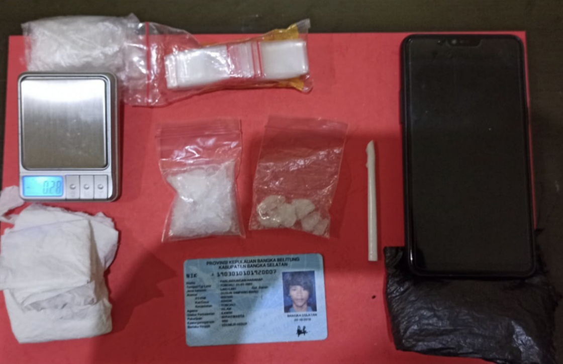 “Ada juga 1 bal plastik bening kosong ukuran kecil, 1unit handphone merk Oppo warna biru metalik, 1 unit timbangan digital warna silver, 3 helai tisu, 1 buah kantong plastik hitam, 1 buah kantong plastik putih, dan 1 buah sekop terbuat dari pipet warna putih,” kata Kompol Widodo.