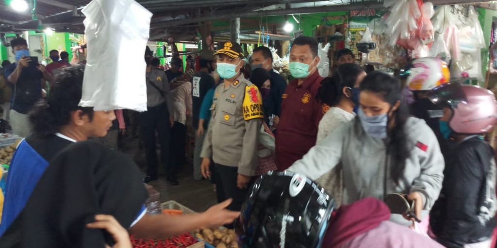 Kapolres Bangka Selatan AKBP S Ferdinand Suwarji didampingi Kasat Reskrim AKP Albert Daniel saat sidak di Pasar Terminal Toboali, Sabtu (23/5/2020) pagi. (Foto: istimewa).